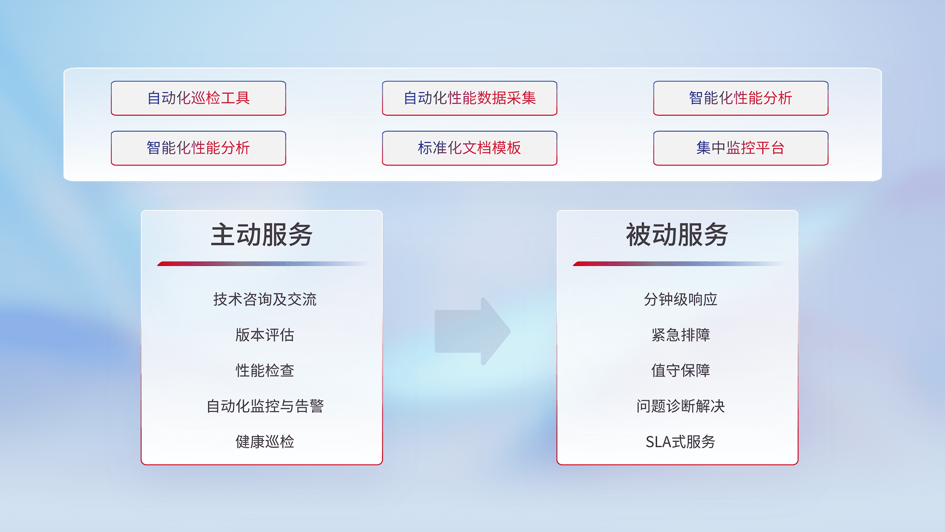 智能化工具和标准化文档,,保障服务质量,,,,提供主动服务(包含技术咨询、、、版本评估、、、性能检查、、、、自动化监控与告警、、健康巡检)和被动服务包含(分钟级响应、、、紧急排障、、值守保障、、问题诊断解决、、、、SLA服务)。。。。